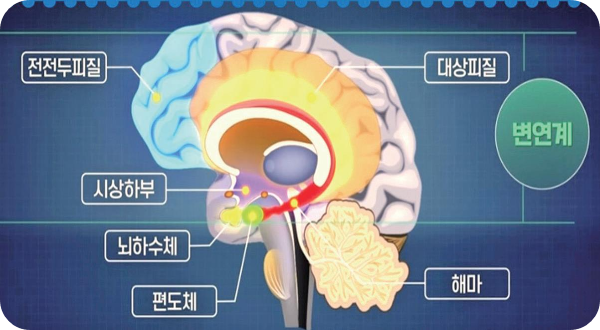 파충류의 뇌가 고작 생명 유지에 급급했다면, 포유류 정도의 고등동물 단계에서는 웃고 울고 화내고 기뻐하는 감정 반응을 할 줄 알게 된 것이죠. 변연계는 인간의 희로애락을 관장합니다. 특히 변연계에 있는 편도체扁桃體(amygdaloid body ; amygdala)는 좋고 싫음을 결정하며 정서적인 기억 과정에 참여합니다. 감정을 만들고 인식하는 일도 여기서 담당해요.
