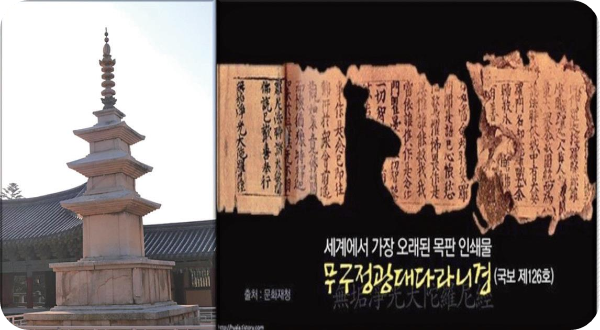 경주 불국사의 석가탑 아시죠? 신라 경덕왕 때 화강암으로 축조한 석탑인데요. 이후에 세워지는 우리나라 석탑의 모본이 되는 기념비적인 3층 석탑입니다. 국보 21호 석가탑 속 사리함에서 ‘무구정광대다라니경無垢淨光大陀羅尼經’이 발견되었는데요. 이는 세계에서 가장 오래된 목판 인쇄물이기도 합니다.
