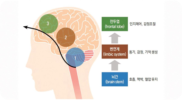 3층 석탑 석가탑처럼 우리 몸의 컨트롤 타워, 브레인Brain(뇌腦)은 3층 뇌탑이에요. 기억과 학습 등의 이성 작용, 희로애락을 비롯한 감정 반응, 호흡과 호르몬 작용 같은 생명 현상 등 인간의 모든 정신 활동은 모두 3층 뇌탑 구조 안에서 이루어집니다.