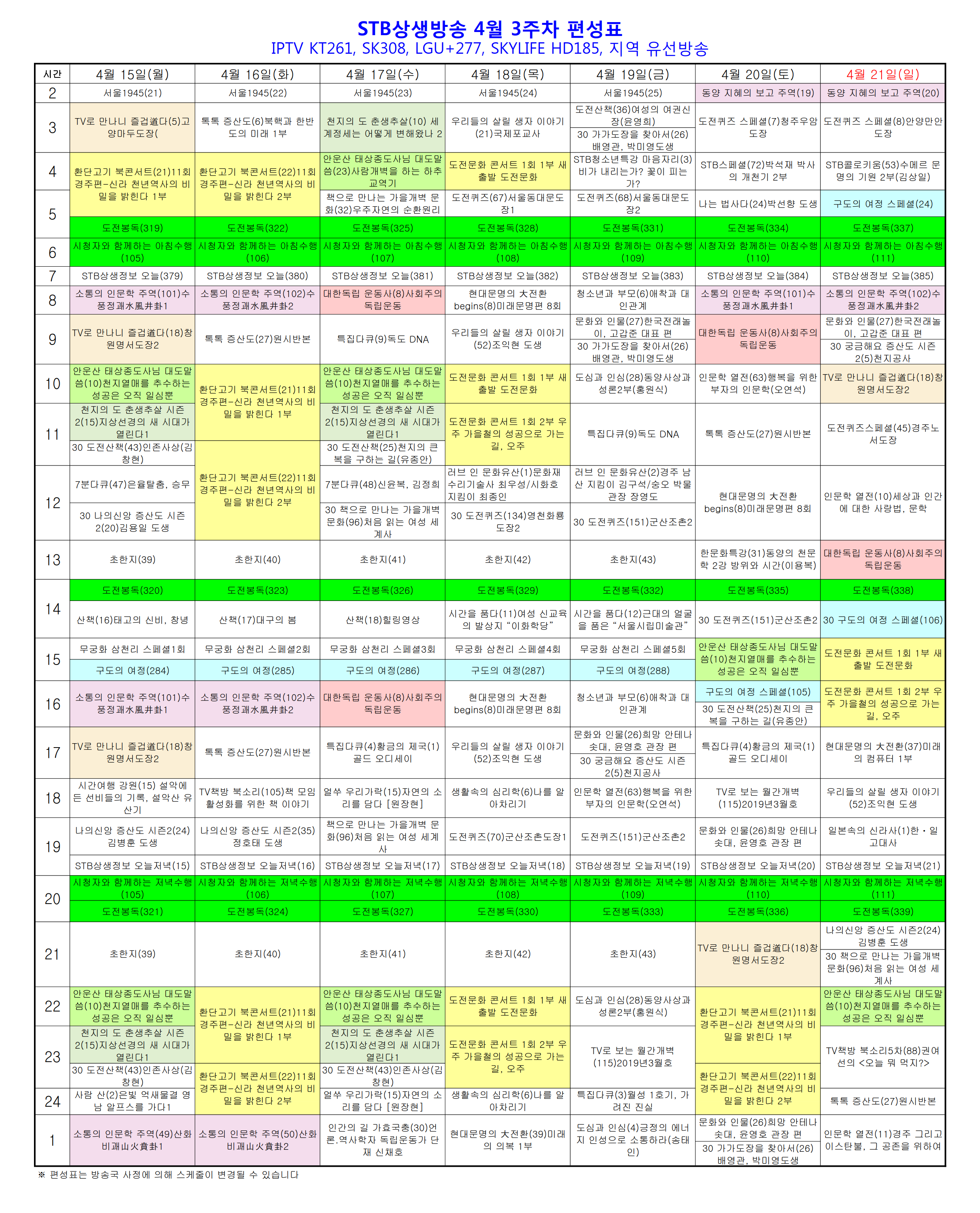 STB상생방송 2019년 4월 3주 주간편성표 및 추천프로그램
