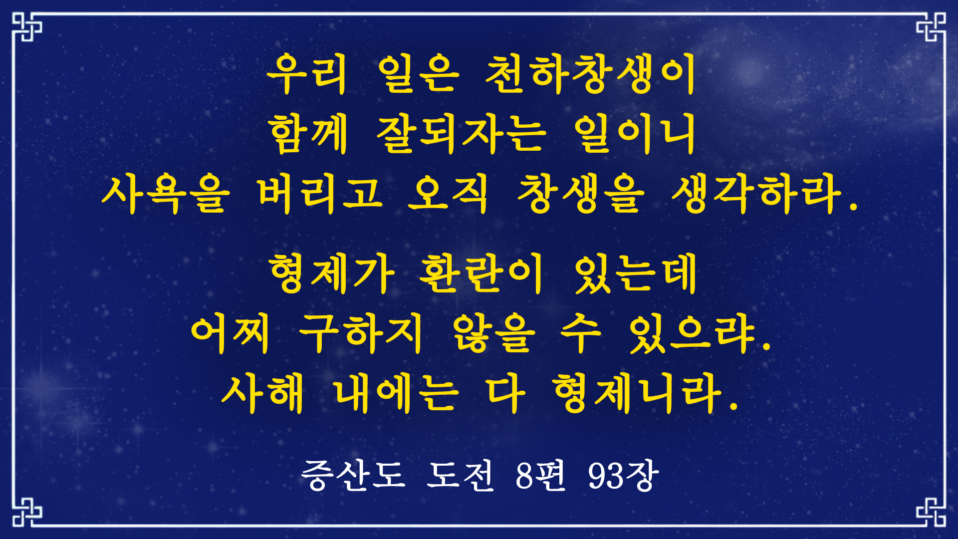 상제님께서는 “때가 되어 병겁이 몰려오면 서양 사람들도 역시 이것으로 건질 수 있습니까?”라고 여쭙는 박공우 성도님께 “천하가 모두 같으니라.”로 말씀해주십니다.