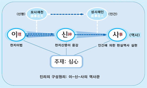 즉, 이법(理)과 인사(人事)를 매개해 주는 보이지 않는 손길, 신도(神道)에 의해서 현실로 펼쳐지는 것입니다.