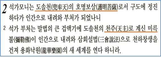 2 석가 부처는 말법의 큰 겁액기에 도솔천의 천주(天主)로 계신 미륵불(彌勒佛)이 인간으로 내려와 삼회설법(三會說法)으로 천하창생을 건져 용화낙원(龍華樂園)의 새 세계를 연다 하니라.