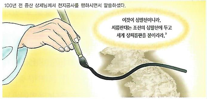 상씨름으로 판을 마치리라." 하시고 종이에 태극 형상의 선을 그리시며 “이것이 삼팔선이니라." 하시니라.