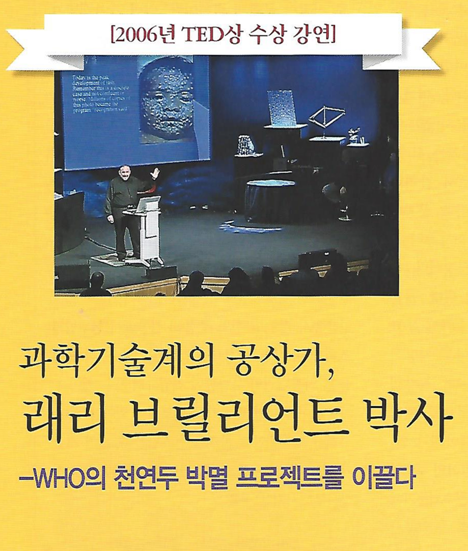 소개드릴 TED의 강연자인 래리 브릴리언트Larry Brilliant 박사는 2006년 TED상을 수상한 인물로, 지구상에서 천연두를 몰아낸 1979년 프로젝트를 이끌었던 장본인입니다. 래리는 강연을 통해 지구상에서 천연두를 몰아낸 핵심이 ‘조기 감지, 조기대응 이었음을 역설하며, ‘조기감지, 조기대응'만이 전염병의 대유행을 막는 해답임을 강조합니다. 전염병과의 전쟁 제1선에서 열정적 활동을 하여온 과학자이자, 지구상 천연두 종식 프로젝트의 장본인이었던 래리 브릴리언트의 명강의를 통해, 가을 대개벽의 전령자인 시두의 문제를 돌아보고, 가족과 이웃을 구하는 시두 방비에 누수는 없는지 점검하는 계기가 되시기 바랍니다.