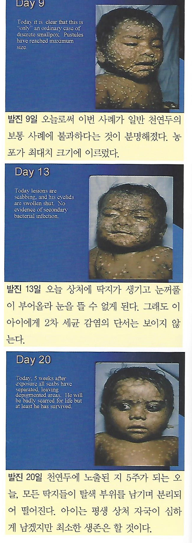 발병 9일째 모습입니다. 이 사진을 본 사람들은 정말 끔찍하다고 생각할지 모르겠지만 래리는 이렇게 말합니다. “하나님 감사합니다.’’ 이 사진은 일반형 천연두에 걸렸으므로 이 아이는 죽지 않을 것이라는 걸 이 사진이 보여주기 때문입니다.