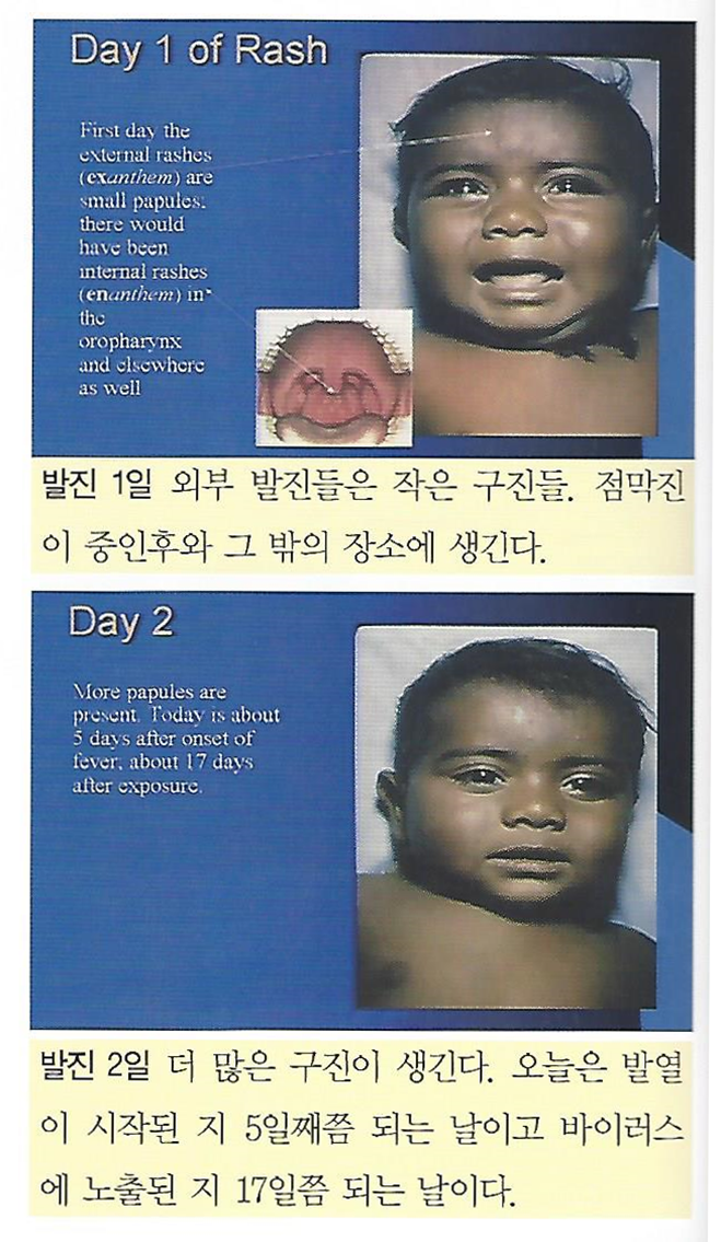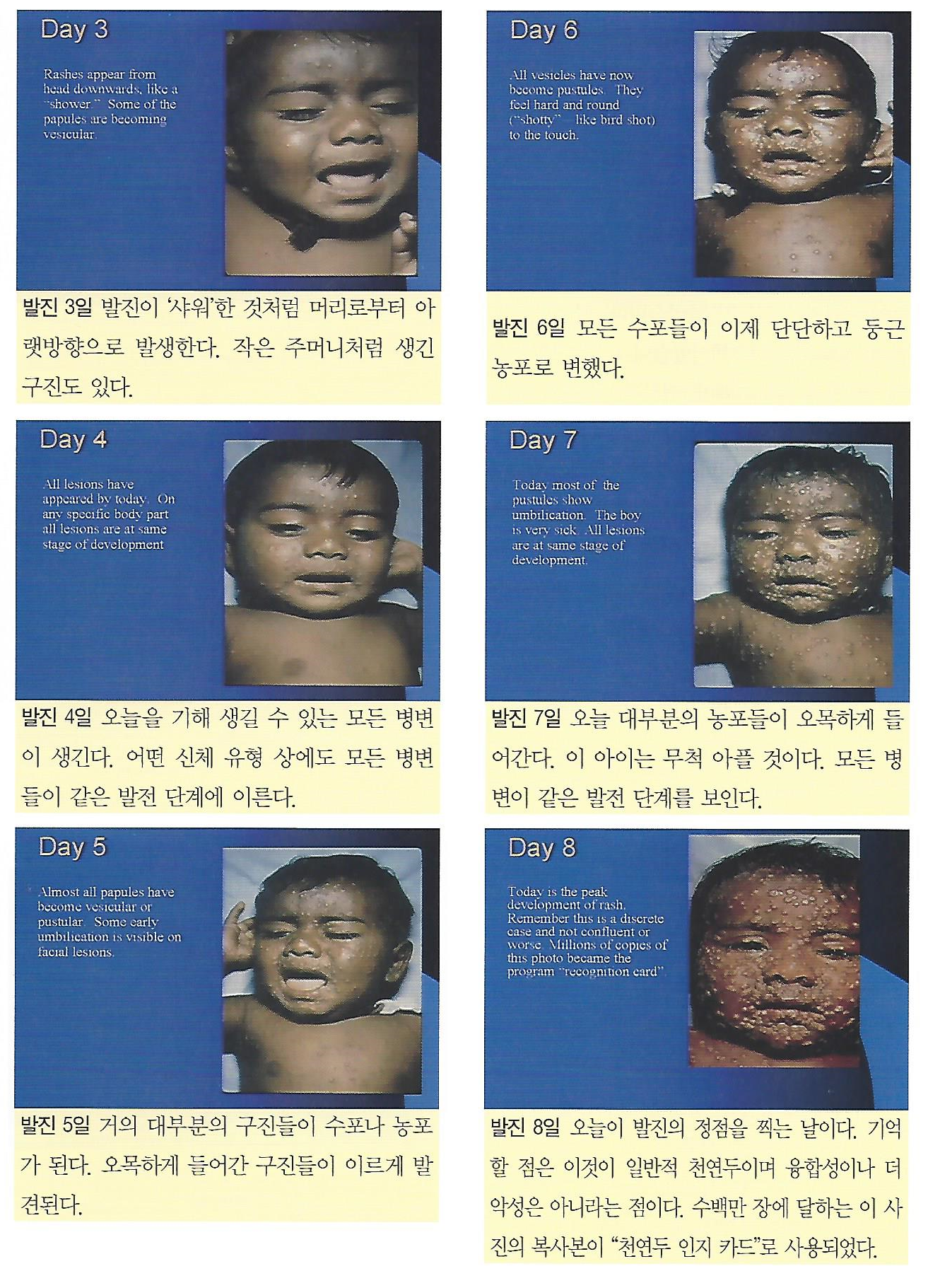 래리의 팀은 이 사진(발진 8일째)을 1974년에 촬영하였습니다. 그리고 당시 이 사진은 세계에서 가장 널리 출력된 사진이었습니다. 래리의 팀이 20억 장을 출력하여 이 사진을 들고 가가호호 방문을 했기 때문입니다. 그들은 사람들에게 사진을 보여주며 식구 중에 이런 모습을 보이는 환자가 있는지 물었습니다. 일종의 그들만의 질병감시 시스템이었습니다. 당시엔 구글이, 웹 탐색 프로그램이, 컴퓨터가 없었으니 말입니다.