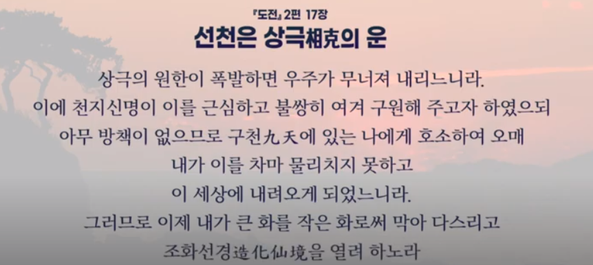 저는 “선천의 상극의 운이라.” 이 한 말씀에 어느 도생님이 해탈을 한 것 같다는 기분이 든다고 하셨는데요. 저도 똑같은 경험을 했거든요. 한 사람의 죄 때문에 이 세상 문제가 생기는 건 말도 안되고요. 선천의 기울어진 극 때문에 이 우주가 억음존양 세상이 되었다는 그 말씀에 저는 깊이 감명을 받았습니다.