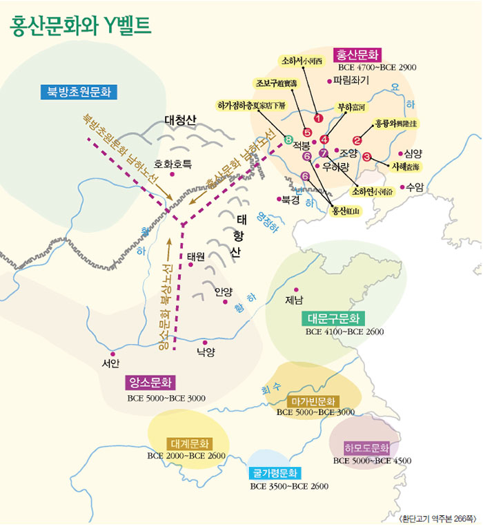 BCE 3500년을 기점으로 만리장성 밖의 홍산문화와 북방 초원문화가 황하 중류 만곡부인 오르도스 지역과 태항산 사이의 노선을 따라 중원으로 전파되었다. 이 문화 전수 경로를 중국 학자 쑤빙치蘇秉琦가 ‘Y벨트’라는 이름을 붙였다. Y벨트를 따라 동방 신교의 제천문화와 삼족오, 용봉, 칠성과 같은 천자문화의 상징이 중원에 흘러들어 갔다. 이것은 중국을 대표하는 신석기 문화인 앙소문화 발전에 크나큰 영향을 끼쳤다. 한마디로 홍산문화는 황하문명의 원류인 것이다.