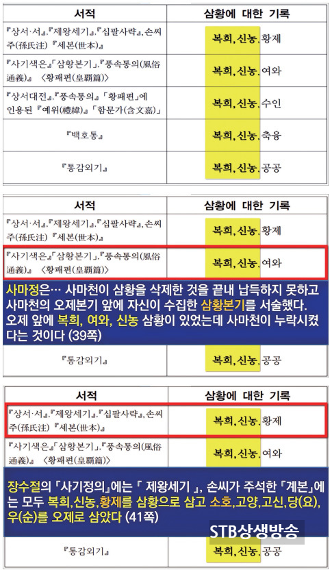 삼황은 흔히 복희伏羲, 신농神農, 황제黃帝를 꼽는데, 복희씨와 신농씨는 부동이지만, 황제는 수인燧人, 축융祝融, 공공共工 등으로 바뀌기도 하였다. 또한 천황天皇, 지황地皇, 인황人皇으로도 말하며 이는 천지인 삼재三才 사상을 나타낸 것이라고도 한다. 이 천지인 사상은 한민족 고유의 핵심 사상으로 이는 동이족 문화임을 알 수 있다. 즉 태호복희씨와 신농씨가 동이족 출신이기에 사마천은 이 삼황을 삭제하려 했음을 저자는 문헌 자료를 근거로 자세히 서술하고 있다.