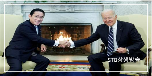 바이든 미 대통령과 기시다 일본 총리가 서로 악수하고 있다>